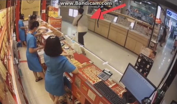 ที่เกิดเหตุพบ น.ส.ทองจันทร์ ภานุรักษ์ อายุ 27 ปี พนักงานของร้านทองดังกล่าวยืนรอให้การถึงเหตุการณ์ที่เกิดขึ้นเล่าว่าเมื่อเวลา 11.20น.ขณะที่ตนและเพื่อนพนักงาน 4 คนให้บริการลูกค้าอยู่ภายในร้าน ได้มีคนร้ายเป็นชายสวมเสื้อยืดแขนยาวสีดำ กางเกงยีนทำที่เข้ามาเลือกดูสร้อยคอทองคำหนัก 2 บาท ตนจึงหยิบออกมาให้เลือกดูจำนวน 2 เส้น ก่อนที่ชายดังกล่าวจะคว้าสร้อยทองวิ่งหลบหนีออกไปจากร้าน แต่โชคดีที่ขณะนั้นมี ส.ต.อ.ณฤิทธิ์ รุ่งโรจน์ อายุ 26 ปี ผบ.หมู่ สน.สำราญราฏร์ ทำธุระอยู่บริเวนนั้นพอดีจึงช่วยกันจับตัวชายดังกล่าวเอาไว้ได้พร้อมของกลางสร้อยคอทองคำหนัก 2 บาท 2 เส้น ราคา 116,700 บาท ส่วนชายที่ก่อเหตุคือนายชินพันธ์ หรืออั้ม พยัคฆเวโรจน์ อายุ 31 ปี เรียนจบวิศวะไฟฟ้า ม.บูรพา โดยใช้รถเก๋ง ฮอนด้าซีวิค สีบรอน ไม่ติดแผ่นป้ายทะเบียน ขับเข้ามาจอดที่ลานจอดรถก่อนเข้าไปก่อเหตุ เจ้าหน้าที่ตำรวจจึงควบคุมตัวพร้อมของกลางส่งพนักงานสอบสวนสภ.บางบัวทอง
