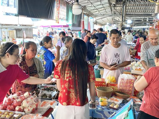เมื่อเวลา 7.00 น. วันที่ 15 กุมภาพันธ์ 2569 ที่บริเวณตลาดสดเทศบาลตําบลคลองใหญ่ บรรยากาศวันจ่ายเทศกาลตรุษจีน ซื้อของไหว้ก่อนเทศกาลตรุษจีน ที่บริเวณภายในตลาดสดเทศบาลตําบลคลองใหญ่ อ.คลองใหญ่ จ.ตราด ซึ่งมีคนไทยเชื้อสายจีนทยอยออกมาจับจ่ายซื้อของเนืองแน่นเต็มตลาดสด ซึ่งมีการจับจ่ายซื้อของเส้นไหว้ประเภท หมู เป็ด ไก่ และผลไม้มงคล เพื่อเตรียมไหว้บรรพบุรุษในเทศกาลตรุษจีน ซึ่งราคาสินค้าเพิ่มขึ้นเป็นบางอย่างแต่ไม่สูงมากนัก เพราะเศรษฐกิจซบเซา และในช่วงนี้กระทบปัญหาชายแดนด้วย ยังมีสินค้าต่างๆมาวางขายด้านในตลาดสดเป็นจํานวนมากอีกด้วย ทําให้พ่อค้าแม่ค้าในตลาดสดคลองใหญ่บางรายต้องใช้ผู้ช่วยขายดีเป็นบางอย่าง เช่น หมู เป็ด ไก่ ขายดีซึ่งทำให้ราคาของสดในท้องตลาดมีราคาไม่สูงมากนักส่วนราคาผลไม้ เช่น องุ่นแดงกิโลละ 160 บาท แก้วมังกรกิโลละ 80 บาท แอปเปิ้ลลูกละ 10 บาท เป็นต้น