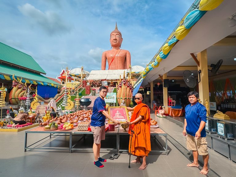 หนุ่มพนักงานบริษัทพร้อมลูก-เมียนำหัวหมู 99 หัวมาแก่บนหลวงพ่อสมหวังหลังขอให้ได้เมีย