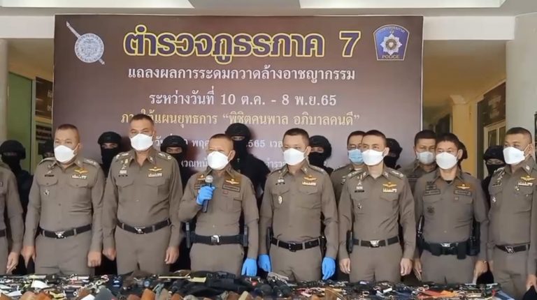 ผบช.ภ.7แถลงผลระดมกวาดล้างห้วง10ตค.ถึง8พย.65จับอาวุธปืน1,077กระบอกยาบ้า638,627เม็ดเฮโรอีน6,989กรัมยาไอซ์6,492กรัมและสิ่งผิดกฏหมายอีกเพียบ