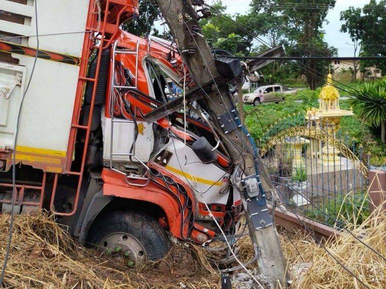 นครนายก – ฝนตกถนนลื่นรถพ่วง22 ล้อถูกรถพ่วงตัดหน้าเสียหลักชนเสาไฟฟ้าหัก
