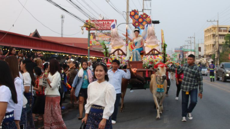 คึกคักโครงการเทศกาลสงกรานต์บ้านหนองขาว จัดขบวนแห่วัวเทียมเกวียน 17 ขบวน มีผู้สมัครเขต 2 หลายพรรคไปร่วมพบปะประชาชนกันถ้วนหน้า