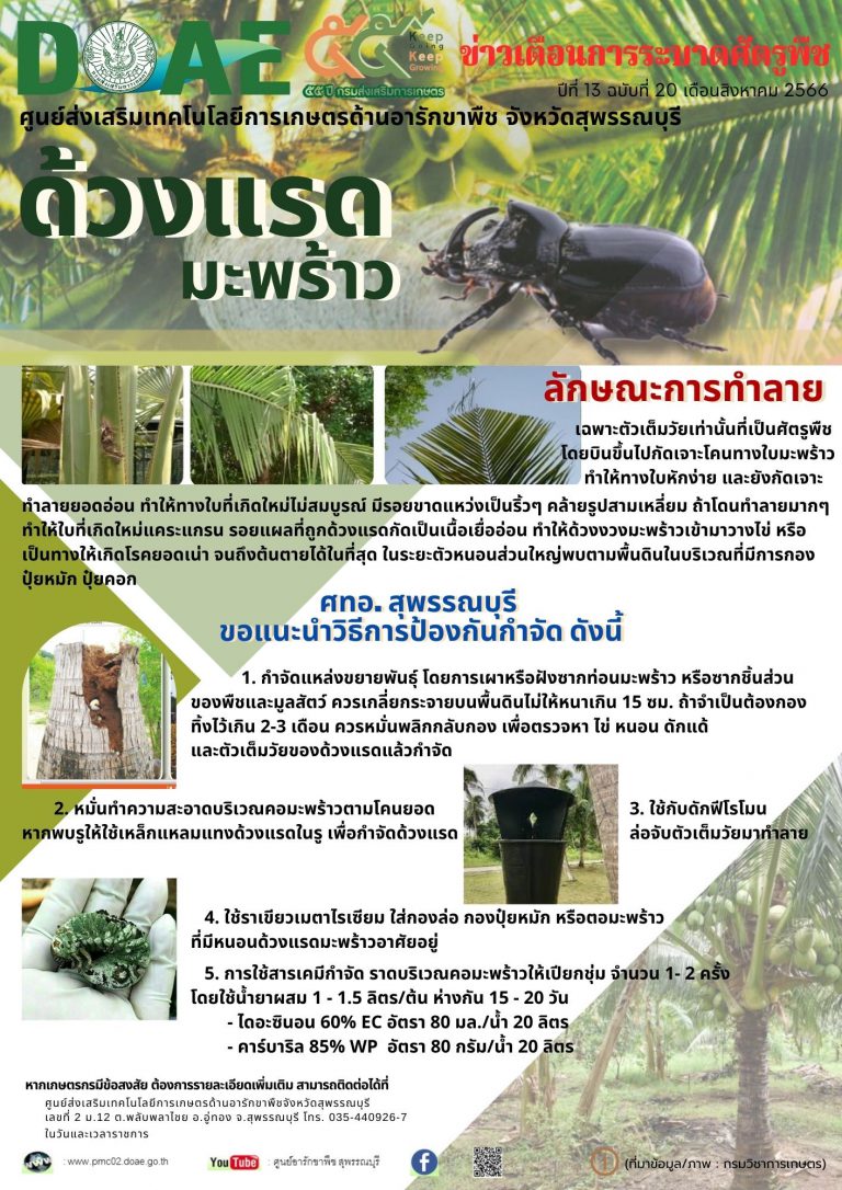 ศูนย์ส่งเสริมเทคโนโลยีการเกษตรด้านอารักขาพืชจังหวัดสุพรรณบุรี สำนักงานส่งเสริมและพัฒนาการเกษตรที่ 2 จังหวัดราชบุรี เตือนการระบาดศรัตรูพืชด้วงแรดมะพร้าว