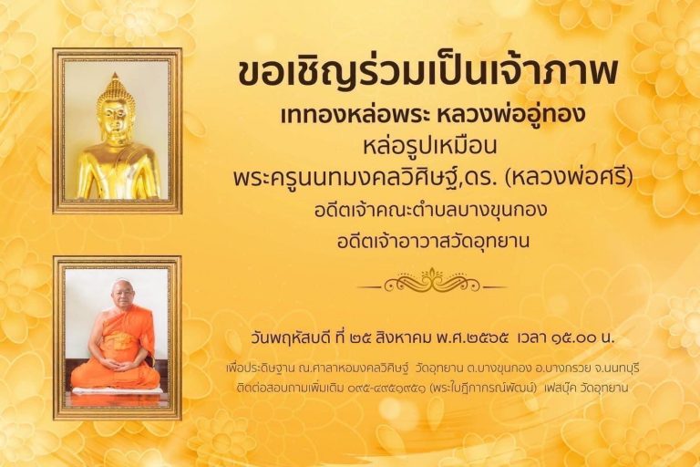 ขอเชิญร่วมบุญหล่อหลวงพ่ออู่ทอง และรูปเหมือนพระครูนนทมงคลวิศิษฐ์ (อดีตเจ้าอาวาสวัดอุทยาน) วันที่ 25 ส.ค.65