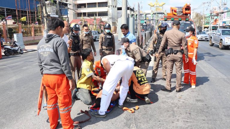 ระทึกกลางแยกไฟแดง เมืองกาญจน์ หนุ่ม ท่าม่วงคลั่ง ปีนขึ้นยอดเสาไฟ ใช้ผ้าผูกคอบนยอดเสา