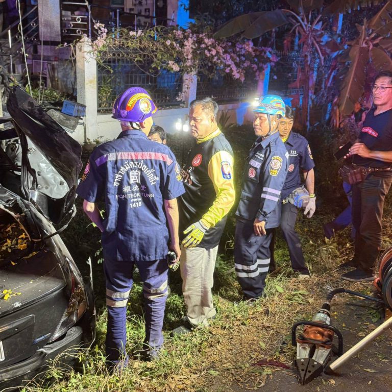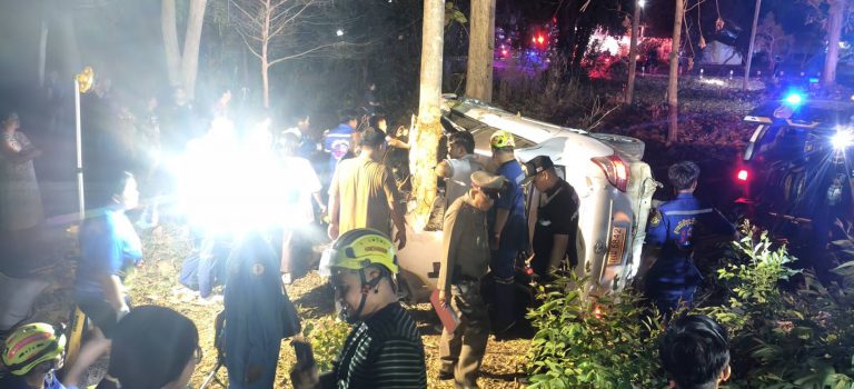 กาญจนบุรี – สลดขับเก๋งกลับจากปิดทอง แต่ไม่ถึงบ้านดับอนาถ!! สองสามีภรรยาเจ้าของร้านก๋วยเตี๋ยว ขับรถเก๋งพาญาติกลับจากกินหมูกระทะ ขากลับรถเสียหลักอัดต้นสักดับคาที่ 2 ศพ สาหัส 2