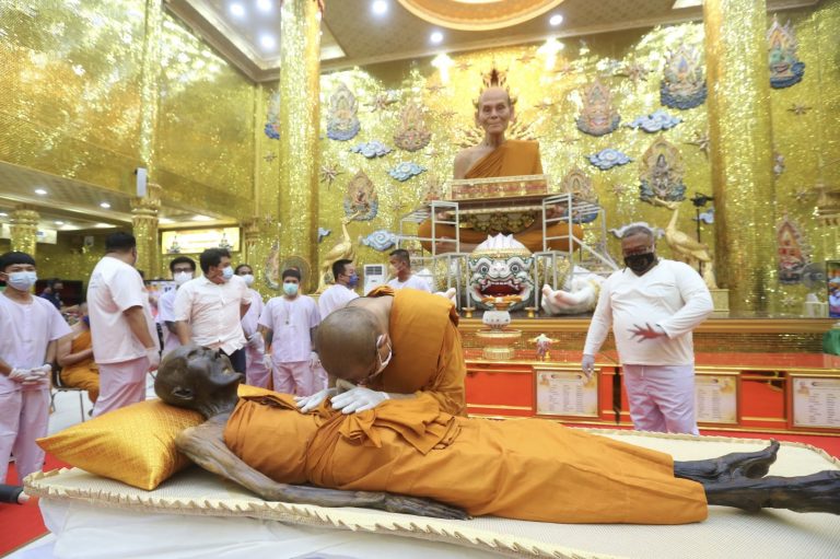 สรีระขารหลวงพ่อพูล ไม่เน่าเปื่อย ผ่องสีทอง คอหวยแห่จดเลข 575 แบงคพันเหน็บประคดในโลงแก้ว