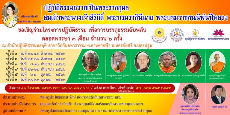 นครปฐมโครงการปฏิบัติธรรม เพื่อการบรรลุธรรมฉับพลันตลอดพรรษา 3 เดือน จำนวน 6 ครั้ง ถวายเป็นพระราชกุศล สมเด็จพระนางเจ้าสิริกิติ์ พระบรมราชินีนาถ พระบรมราชชนนีพันปีหลวง